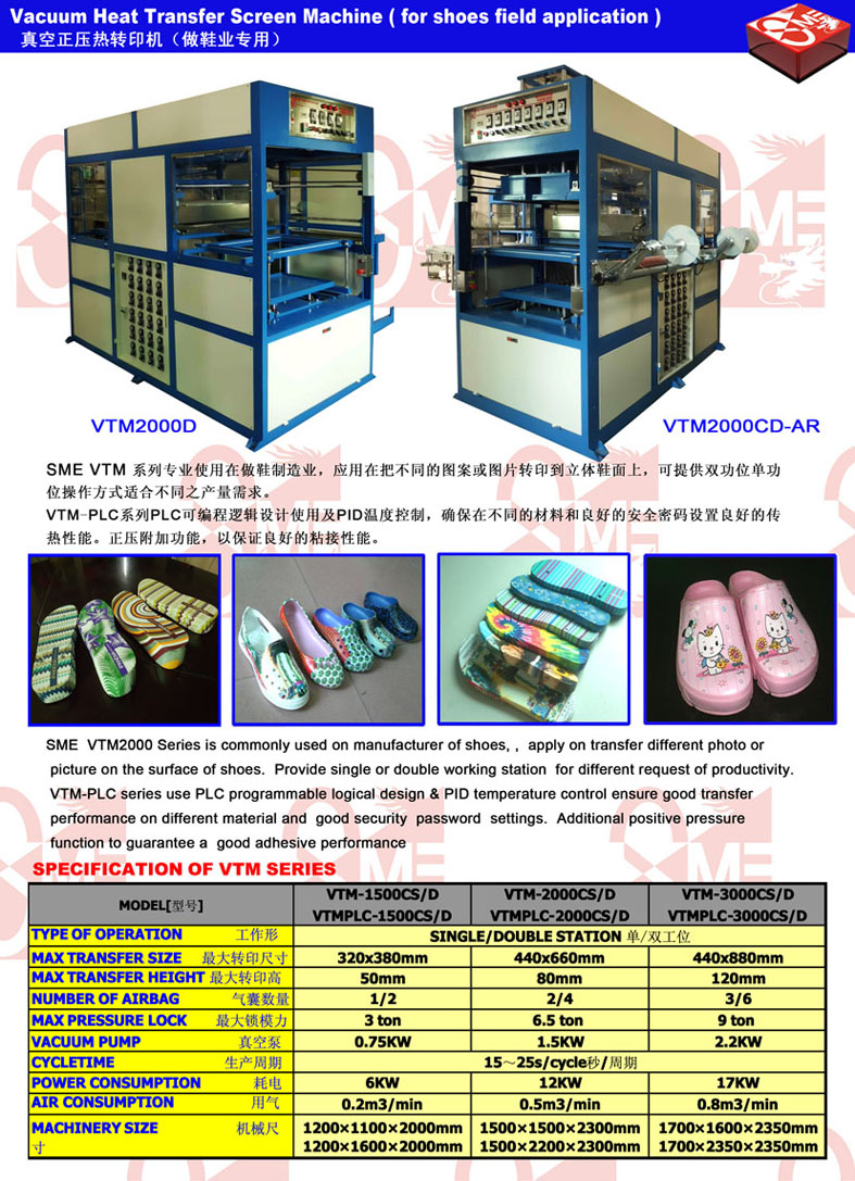 本工藝可解決在立體/曲面的產(chǎn)品表面上(如:筆記本計(jì)算機(jī)、i-phone、塑料產(chǎn)品外殼、行李箱,MP4,EVA花園鞋、人字拖鞋、涼鞋、不同材質(zhì)的休閑鞋)印刷圖案,通過此-立體真空熱轉(zhuǎn)印機(jī)械-將轉(zhuǎn)印膜上的精美平面圖像..清晰亮麗地展現(xiàn)出來。這新技術(shù)可幫助顧客節(jié)省費(fèi)用和得到最優(yōu)秀與最耐久的圖像。